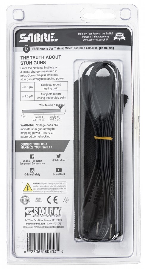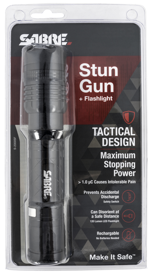 Stay safe on the go with the SABRE Stun Gun with LED Flashlight in green. Featuring a 1.820 C (Microcoulombs) charge, this stun gun produces intolerable pain according to the National Institute of Justice. Maintain peace of mind knowing that the safety switch will help to prevent accidental discharge. The bright, built-in 120 lumen flashlight helps to disorient an attacker at a safe distance, possibly allowing you to escape to safety before needing to use the stun feature. The flashlight also helps to make unlocking doors and finding essentials in a bag quick and easy. Rugged, tactical design is made from aircraft grade aluminum and is durable for everyday use. The stun gun is easily carried on a belt loop for quick access. Includes belt holster and charging cable.