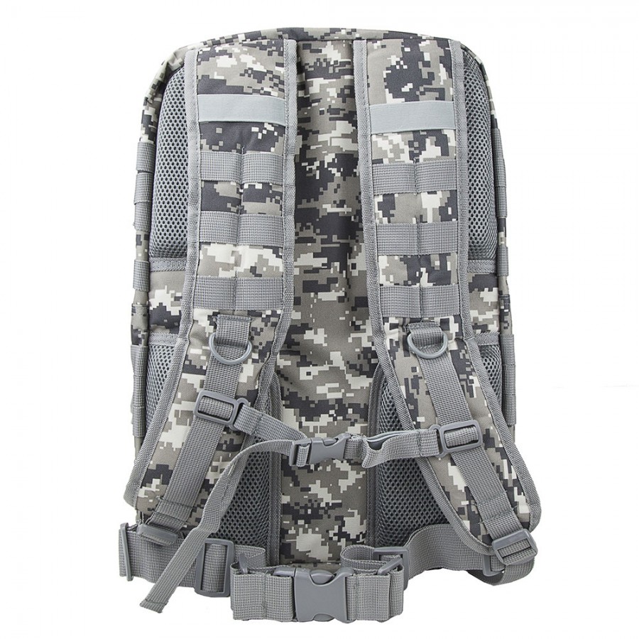 MOLLE compatible webbing on the front & bottom pockets, shoulder straps, and the sides of the backpack.