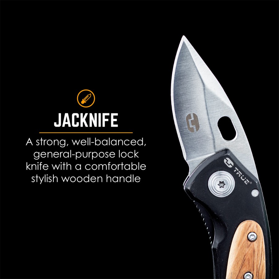 The JacKnife is a strong, well-balanced, general-purpose lock knife with a comfortable stylish wooden handle with ambidextrous one handed opening and closing. Easy to hold and use, the belt clip conveniently attaches to a belt, bag or pocket.