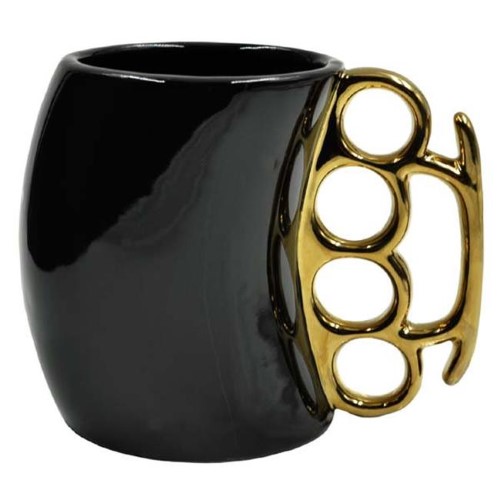 When Morning Sneaks up on you, you need something that packs a punch! This smashing new mug will deliver a fistful of your favorite beverage. Gripped in the fist, Our Brass Knuckles Coffee Mug gives you the strength you need to knock your day out in a single punch. The perfect edge you need against your daily grind! Consider it "protection" from whatever your day decides to dish out. Features Hand wash only Not microwave safe Not dishwasher safe. Specifications Color: Black & Gold Material: Ceramic Dimensions: 4.75 x 3.25 x10.