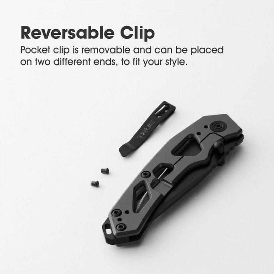The Tactical Knife features a partially serrated, 3.25” black oxidized stainless steel blade. The minimalist handle is designed for lightweight carry and an ergonomic grip. The base of the handle features an emergency glass breaker and the pocket clip is reversible and removable to suit your specific carry style.