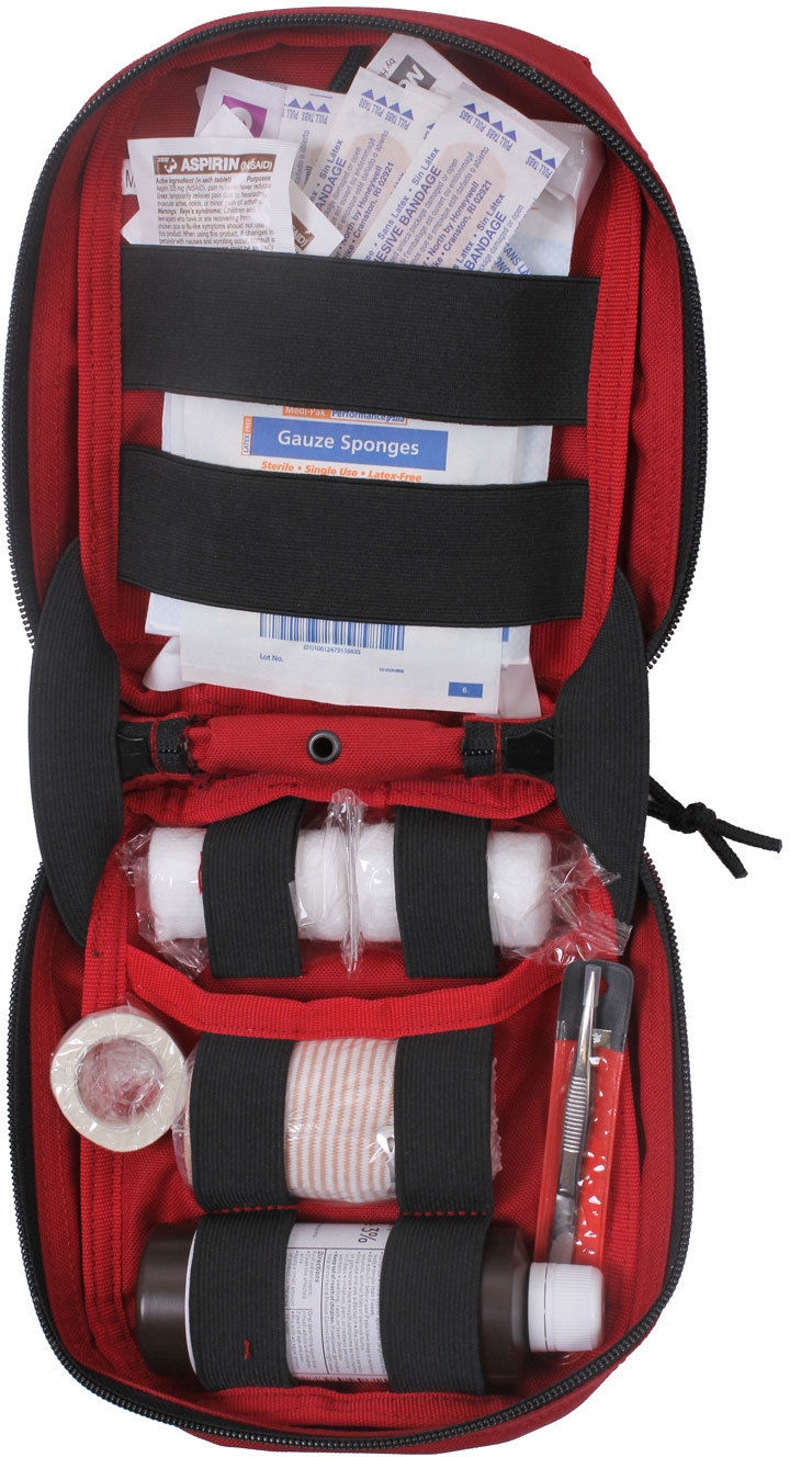 #mobile-renderer { display: none }@media screen and (max-device-width: 480px), screen and (max-width: 480px) {#desktop-renderer { display: none }#mobile-renderer { display: block }}Red MOLLE Tactical Trauma First Aid Kit (Item #: 8778)Designed to be attatched to MOLLE compatible tactical equipmentDimensions: 7" x 8" x 3"Features one inside pocket and elastic bandsTwo Military bandagesFour 2" steripadstwo 3 " steripadstwo 1/2" adhesive tape rolleight 3/4" x 3" bandagesfour 1-1/2" x 7/8" bandagesOne 3" elastic bandageone 3" x 4" tefla padTwo medium alcohol prep padTwo antibiotic ointmenttwo bzk towelettetwo small packets of sugarone 1/2 oz. soapone 4 oz. peroxideone medium cold packtwo aspirinone tweezerone pair of examination gloves.