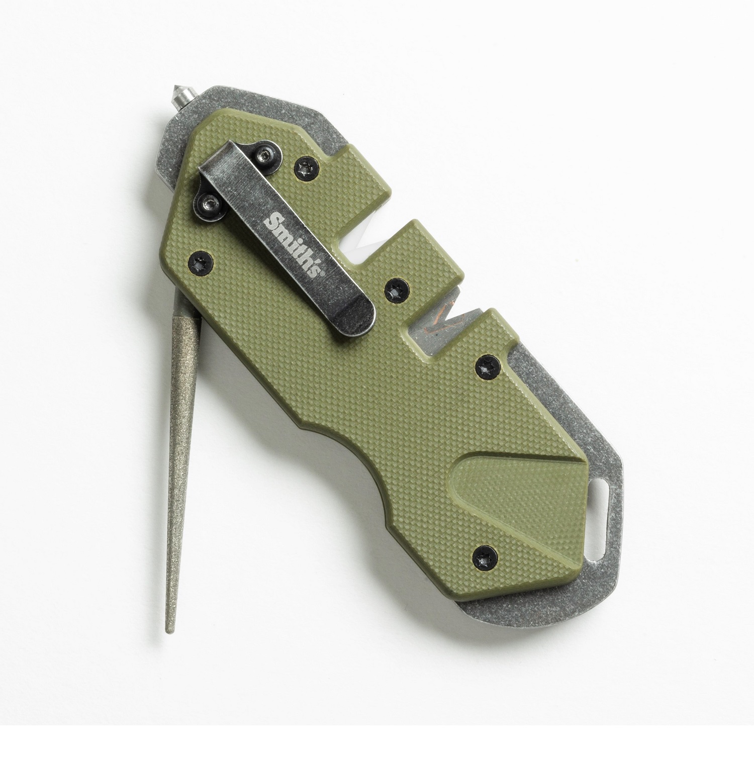 Smiths Pocket Pal Tactical Sharpener features G-10 handle with a 420 stainless steel frame, Tungsten Carbide glass break, Pocket Clip, pre-set crossed carbides and ceramic stones which provide the Perfect Edge every time. Carbides provide quick edge setting, and the specially shaped ceramic stones are designed to give you a razor sharp edge on either standard or serrated edges. A fold out, tapered round, diamond coated rod is designed for sharpening serrations and small gut hooks. Unit is compact, lightweight, durable, and comes with a lanyard hole.